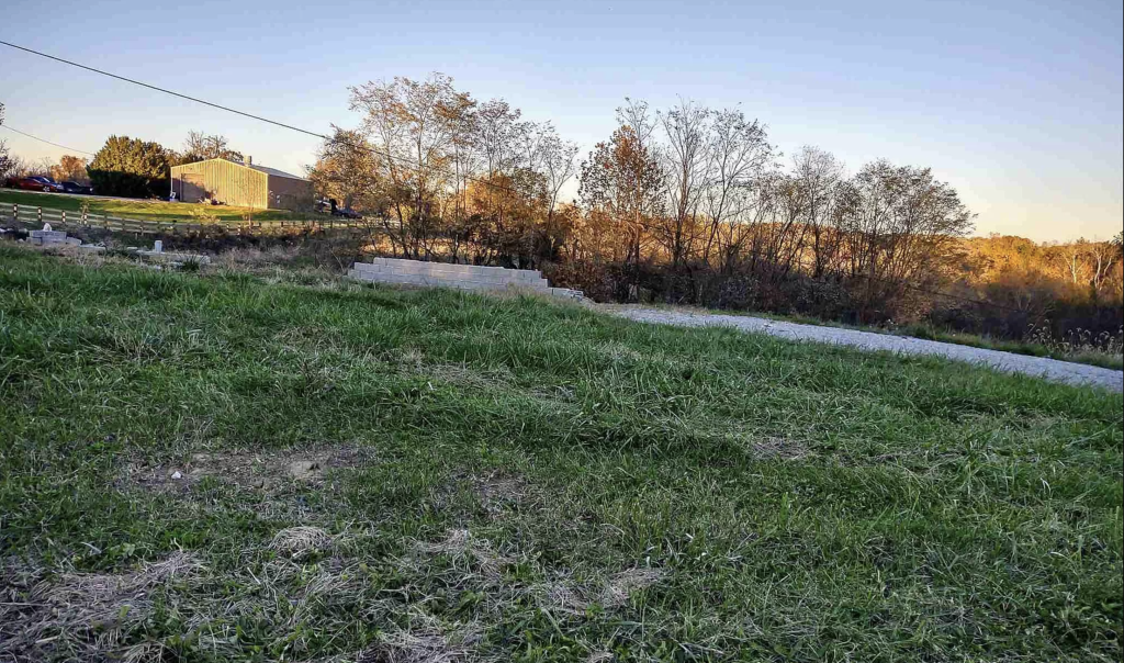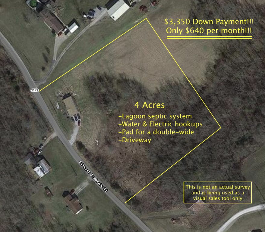 4 acres, just outside of Falmouth, property has a septic system, water & electric hook ups, driveway, all in place. NO single wides. Property is rolling and hilly with some woods.